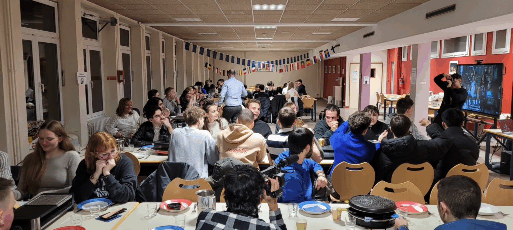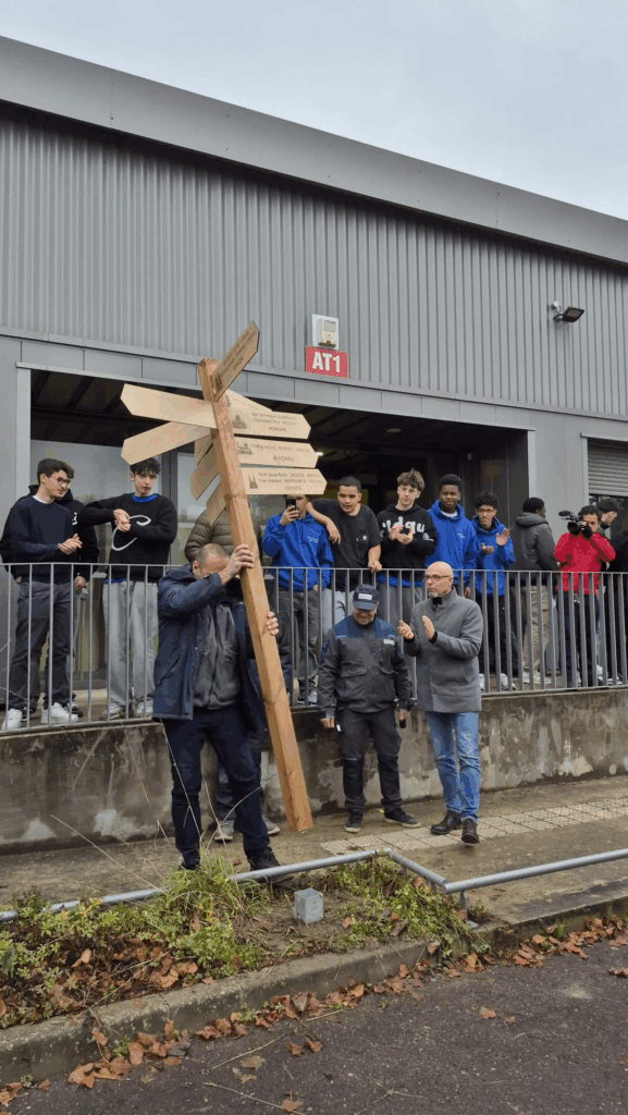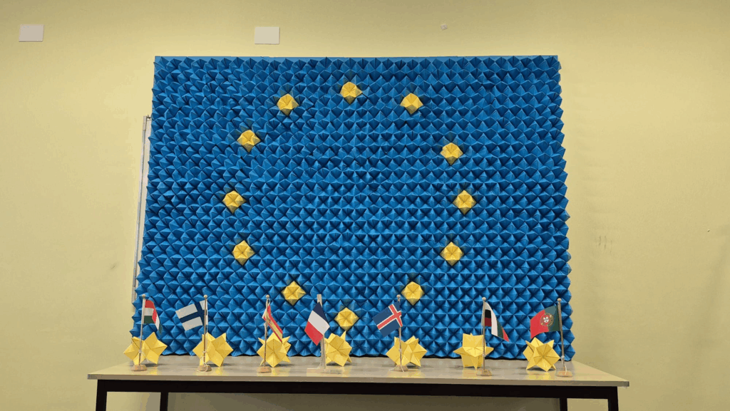 Inauguration du drapeau européen et du totem des mobilités après le discours du Proviseur et la chanson apprise et chantée par les élèves des 7 pays !